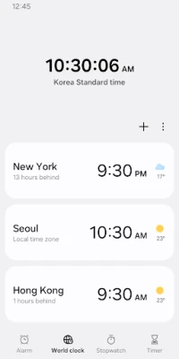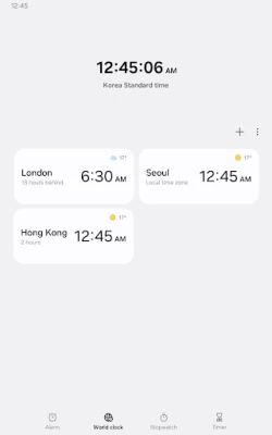The Clock app provides Alarm, World Clock, Stopwatch, and Timer features. Use the Clock app to manage your time efficiently, as well as check the weather by city.