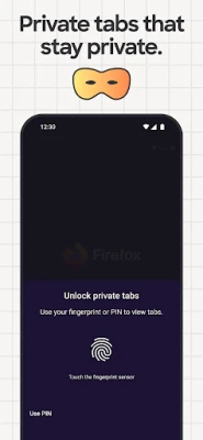 • Hide Private Tabs. Private browsing mode can auto-lock when you leave, and require your face, fingerprint, or PIN to unlock.