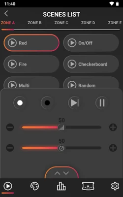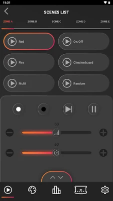 - Manage in real time scenes, RGB/W colours, dimmer and speed.